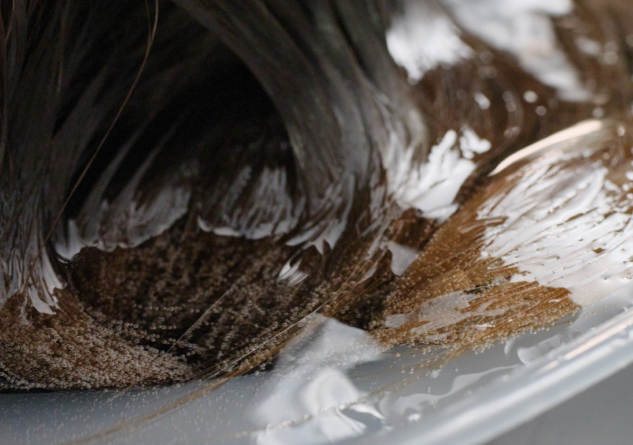 頭浸浴の炭酸によって、カラー後の髪に残っている色落ちやダメージの原因になる薬剤成分を除去。
